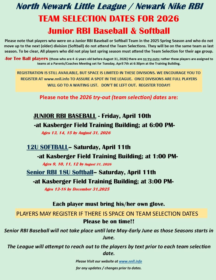 Players who are High School Seniors are also eligible to apply for the RBI for RBI College Scholarship a Four Year, $5000. per year or $20,000 College Scholarship. Five Newark RBI Players have been past recipients. We invite you to join our RBI Softball Family. Newark Residency is not required. For more information email us at nwkbaseball@aol.com or reach out to Mr. Vince Coleman at 908-220-2503